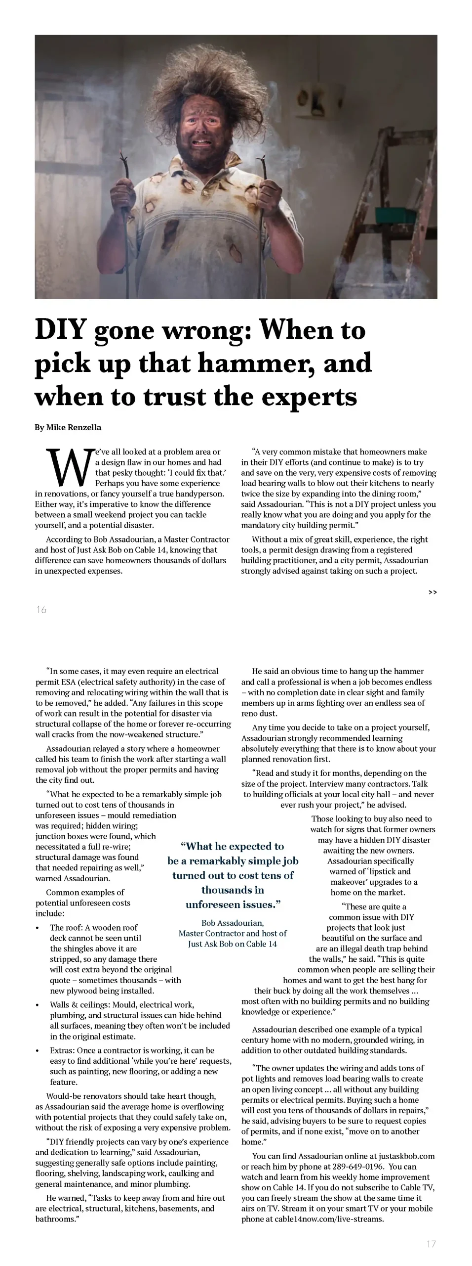 Bob is interviewed by the Haldimand Press: “DIY Gone Wrong: When to pick up that hammer, and When to trust the experts”.
